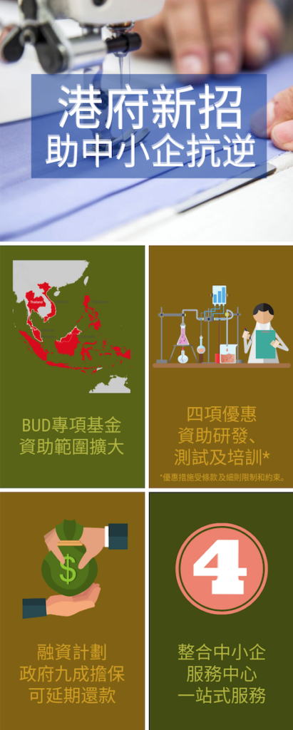 最後一項措施是,政府將從本月1日起,整合工貿署、貿發局、科技園及生產力促進局現有的4個中小企服務中心,為中小企提供統一的一站式服務,包括講解基金申請方法。