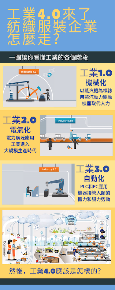 科技日新月異,為紡織世界帶來各種新技術,亦衝擊舊有產業模式。《香港紡織報》由今期開始,將會專題介紹紡織工業日新月異的變化,讓各同業參考,共同實現香港紡織界的自我增值。本期介紹「工業4.0」。