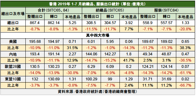 中美貿易摩擦持續,加上部份主要經濟體增長放緩,香港貿易備受壓力。1-7月紡織品、服裝(下簡稱紡衣)出口數據強差人意,跌幅加劇,預料貿易爭端的負面影響將進一步抑制香港的出口表現。