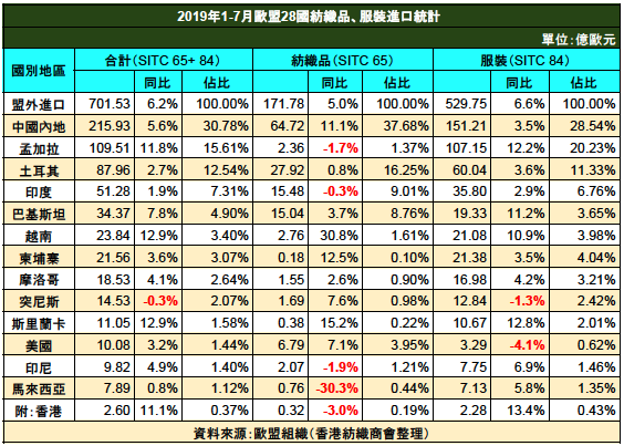 根據歐盟組織統計,2019年1至7月歐盟進口紡衣金額(按標準國際貿易分類SITC 65、84)與2018年同期相比,上升6.2%。但是以數量計算則輕微下跌0.11%。今年以來,歐元貶值導致歐盟服裝進口成本增加,因此歐盟服裝進口量減少。 6月份,歐盟服裝進口平均單價同比上漲超過6%,按美元計算只上漲1.3%。個別國家表現如下: