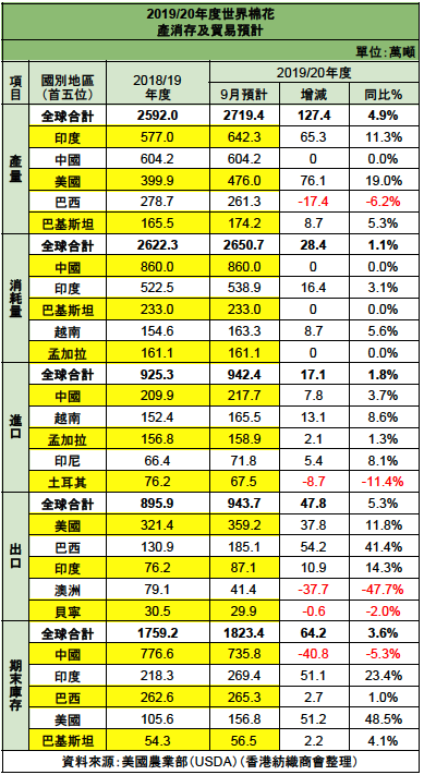 據美國農業部(USDA)9月統計,2019/20年度全球棉花市場形勢,產量仍然大幅領先需求,呈供大於需情況,2019/20年度預計產量2719.4萬噸,消耗量2650.7萬噸,兩者大致相若。美國和印度的產量大幅回升,尤其是美棉反彈達19.0%,但巴西預計產量增加卻稍為回落5.3%。具體特徵如下: