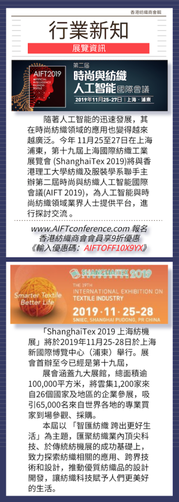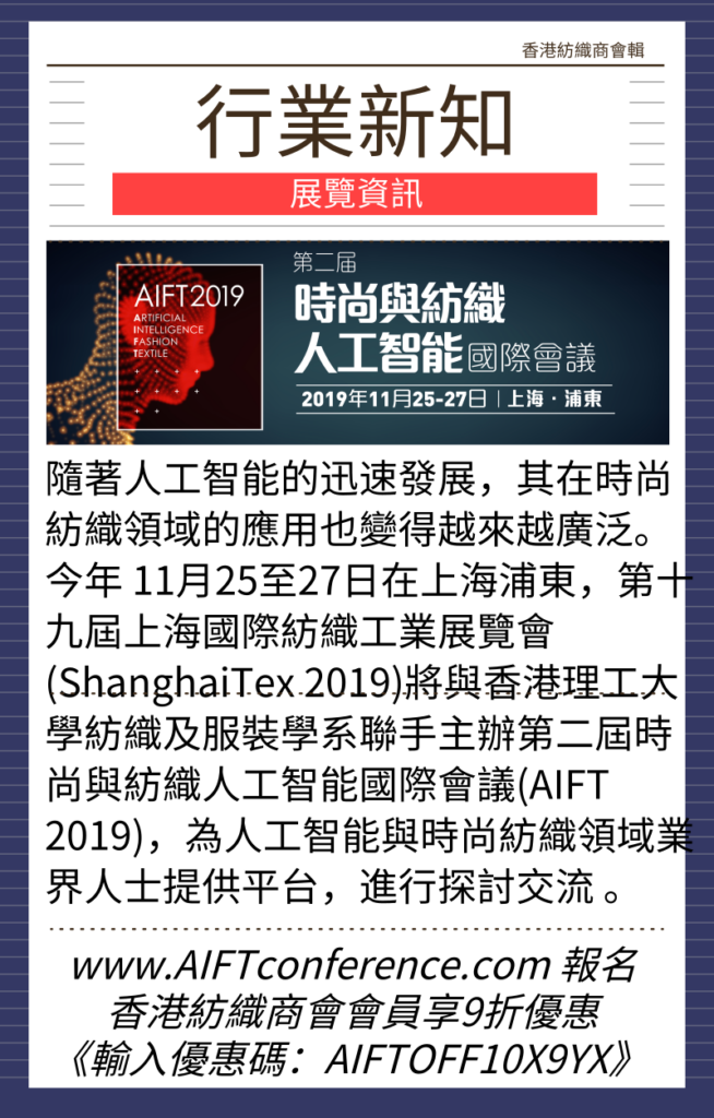 上海與香港兩地將於今年11月在滬攜手舉辦時尚與紡織人工智能國際會議,合力推動中外紡織時尚產業與人工智能科技的融合。會議將於11月25至27日與「2019上海紡機展」在上海浦東同時同地舉辦。會議的重點主題包括物聯網、紡織和服裝供應鏈建模、智慧紡織品服裝以及可穿戴設備、3D建模及虛擬試衣等,重點分析人工智能為紡織及時尚業界帶來的機遇和挑戰。香港理工大學紡織及服裝學系、相關領域的院校和機構還將在上海成立人工智能聯盟。