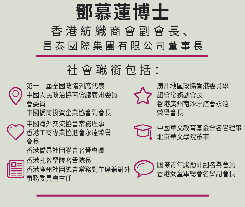 「在工作中,當挑戰來臨的時候,只要我們肯主動去看清楚挑戰的根源,很多時候都可以扭轉逆境,加強競爭力。」本會新任副會長、昌泰集團董事長鄧慕蓮博士以「逆境自強」四字作為做人做事的感悟,也是她對香港紡織業未來發展的寄寓。