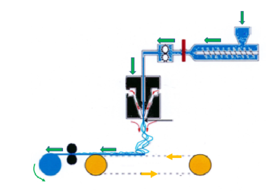 鑑於熔噴不織布對防疫口罩生產的重要性,涉及高品質及高科技擋次,本人就此簡略介紹一下熔噴不織布生產關鍵技術,藉著調控可變技術參數包括纖維材料、螺杆擠出機溫度及速度、熱空氣溫度、熱空氣流量、熔噴模頭溫度、模頭噴絲孔擠出纖維聚合物熔體到凝聚收集器的距離,收集器速度等量數都可調校,達致所需纖維直徑細度和纖維網橫向和縱向均勻度、重量, 孔徑大小等等, 都取決於上述參數互相調校及正確選擇[1]: