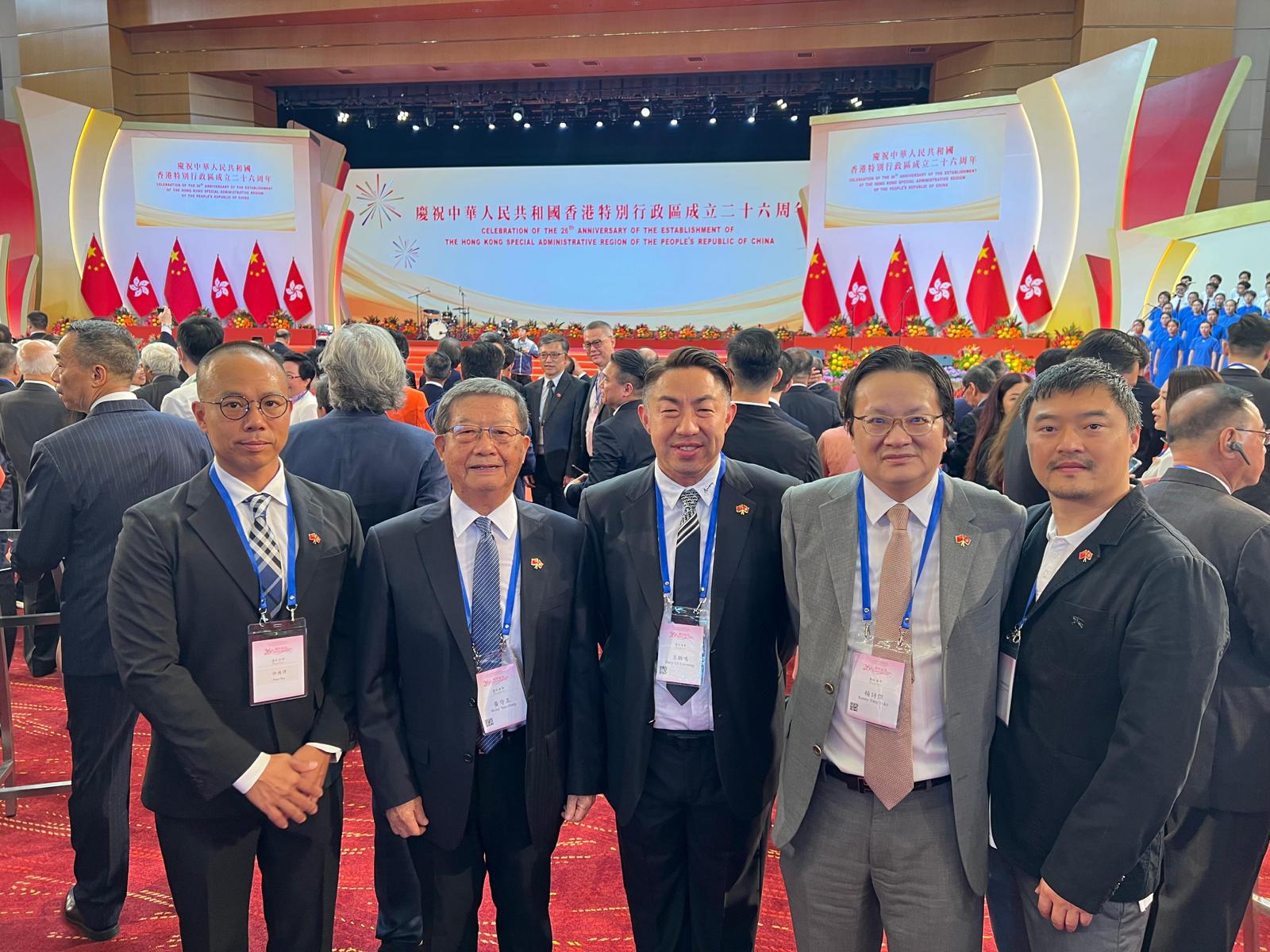 155期-香港特別行政區成立26周年慶祝酒會 / 商會動態 / 作者: ivan 7月1日,(左起)特邀榮譽顧問許彼得、永遠榮譽會長黃守正、監事長呂䏈鳴、常務會長楊詩傑、特邀榮譽顧問羅正杰出席香港特別行政區成立26周年慶祝酒會。