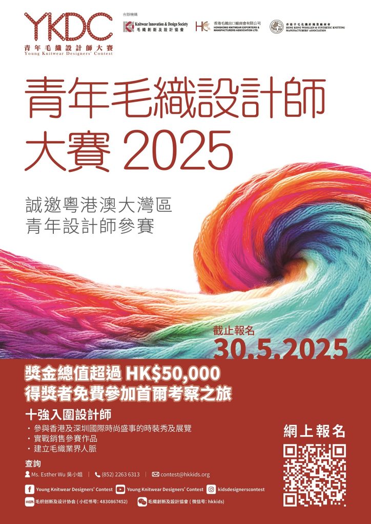 由毛織創新及設計協會主辦的「青年毛織設計師大賽2025」,現正公開招募粵港澳大灣區18 至35歲的時裝設計師或正就讀時裝設計相關課程的學生參賽,香港紡織商會也是支持機構之一。參賽者須設計8套毛織服裝,成功入圍的10名設計師,將於香港及深圳國際時尚盛事的時裝秀和展覽裡展示參賽作品,兼學習於綫上及綫下銷售平台推廣銷售自家設計毛織作品。是次設計比賽獎金總值超HK$50,000,得獎者更可免費參加韓國首爾考察團。大賽將於5月30日截止報名,如欲參賽,請前往以下網頁了解詳情及報名︰
