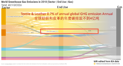 據世界資源研究所WRI引用國際能源署IEA發布的年度全球碳排放數據的統計,2019年全球紡織和皮革業排放在2.99億噸左右,占全球排放量的0.6%,其中能源占紡織和皮革行業溫室氣體排放的83%。
