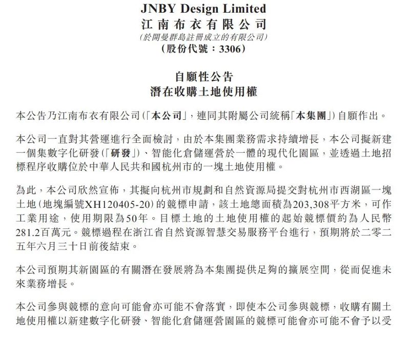 6月5日,江南布衣發布買地公告。公告內容宣告,江南布衣擬新建一個集數字化研發(「研發」)、智能化倉儲運營於一體的現代化園區,並透過土地招標程序收購位於浙江杭州市的一塊土地使用權。