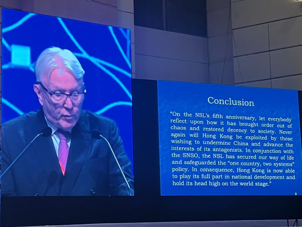 選委代表出席國安法公布實施五周年論壇 / 會員動態, 香港紡織報 / 作者: wong chris 6月21日,選委代表今日獲邀出席於香港會展中心舉行的「香港國安法公布實施五周年論壇」,由港澳辦主任夏寶龍主禮並致辭。 香港紡織商會永遠榮譽會長黃守正、陳亨利、常務副會長楊燕芝出席。 夏寶龍指出,自2020年6月30日國安法實施後,香港進入由亂及治、恢復穩定的新時期,法治體系日趨完整,社會安寧有目共睹。 論壇上夏寶龍主任強調要警惕外部敵對勢力干預、確保愛國者治港,並以高水平安全保障高質量發展。香港未來仍需強化安全與發展並重,走穩「一國兩制」高質量之路。
