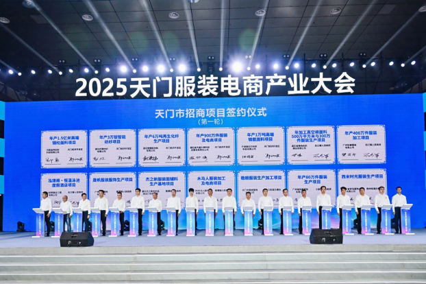 據天門市委書記、市人大常委會主任紀道清介紹,天門文脈昌盛、產業基礎雄厚,近年來多項指標居全國前列。當前,天門處於優勢重塑期、資源集聚期、人氣升騰期、趕超窗口期、幹事黃金期“五期疊加”的關鍵期,且已經形成了“紡紗織造—面輔料—成衣加工—電商營銷—跨境物流”的完整產業鏈條,正全力打造“服裝設計之都、生產之都、營銷之都”。未來,通過人工智能賦能,將加速實現“小單快返、柔性制造、AI直播”等創新模式。同時,還將加快建設10個海外倉,目標2025年電商交易額達700億元,2026年全產業鏈產值突破1000億元,向“全球服裝電商供應鏈中心”邁進。