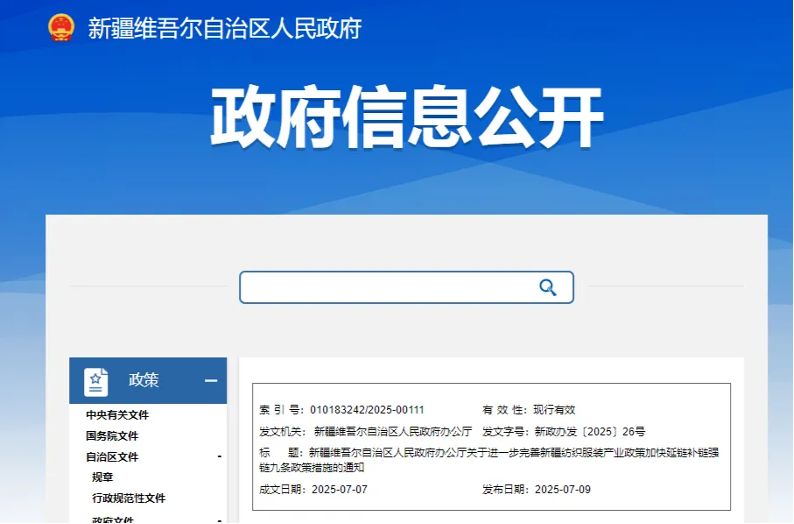 日前,新疆維吾爾自治區人民政府發布《關於進一步完善新疆紡織服裝產業政策加快延鏈補鏈強鏈九條政策措施的通知》。