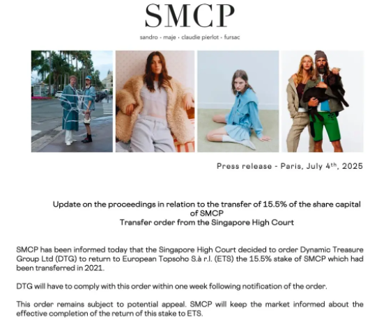 近日,法國時裝品牌 Sandro、Maje、Claudie Pierlot 和 Fursac 的母公司、法國時尚集團 SMCP近日發布公告稱,新加坡高等法院已裁定要求Dynamic Treasure Group(簡稱DTG)將2021年從 SMCP的母公司——European TopSoho(簡稱ETS)那里獲得的 SMCP 15.5%的股權歸還給ETS。