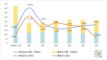 圖1 2025年1~8月全國紡織品、服裝出口月度統計