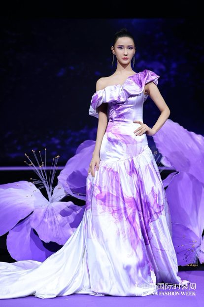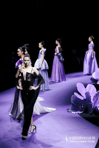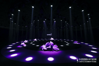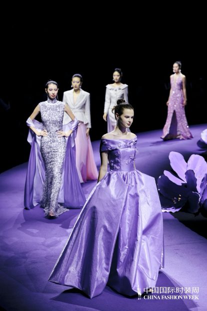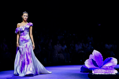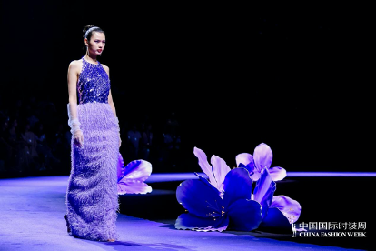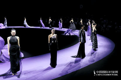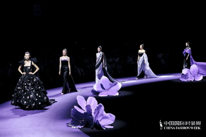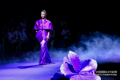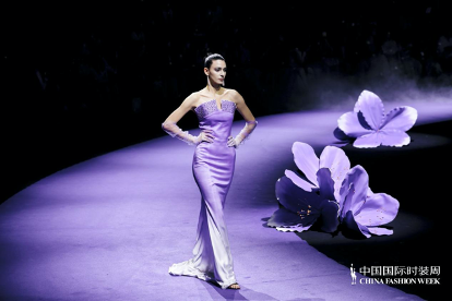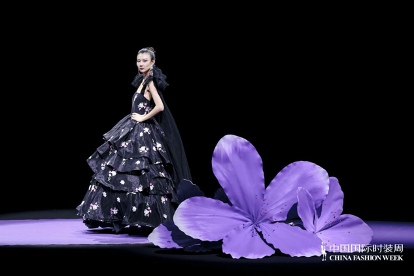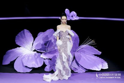 步入秀場,觀眾仿佛墜入一個被施以魔法的東方花園。舞台以品牌標志性的紫荊花為靈魂裝置,延續經典紫色基調,營造出花團錦簇、蝶舞鶯啼的夢幻之境。這不僅是品牌十周年的鎏金獻禮,更是創始人關淑敏以十年以針線作筆、以絲綢為墨,寫給東方美學的千行長詩。