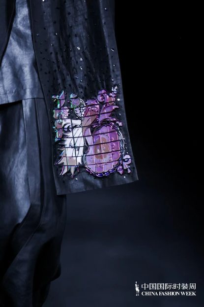 本次,在延續與強化往季的經典廓形與剪裁的基礎上,以香雲紗與百鳥衣為靈感索引,將翺翔的遊龍、蜿蜒的靈蛇、迅捷的飛鳥進行大膽演繹,營造出了一種融貫古今、連接東西的獨特質感。設計師借助PHA Z2501材料的3D打印工藝,將百鳥衣中的圖騰沈澱再升華,並融合細膩的刺繡,捕捉蝴蝶振飛的生動瞬間。經由算法重新詮釋的百鳥衣圖騰,既承載著醇厚的中國傳統文化與匠心精神,更融入了“天人合一”的東方哲學。