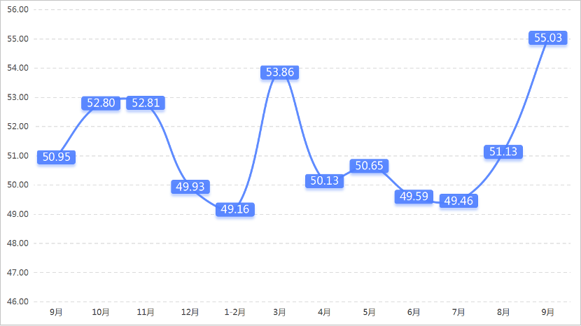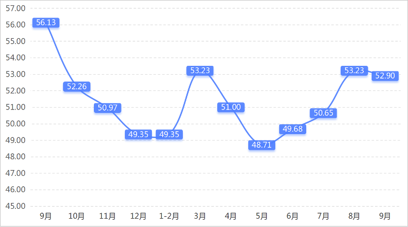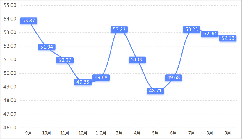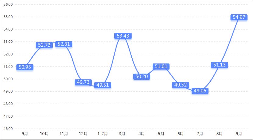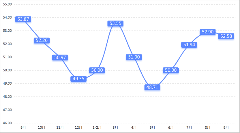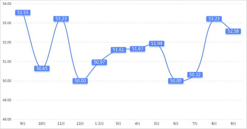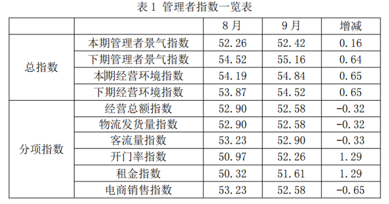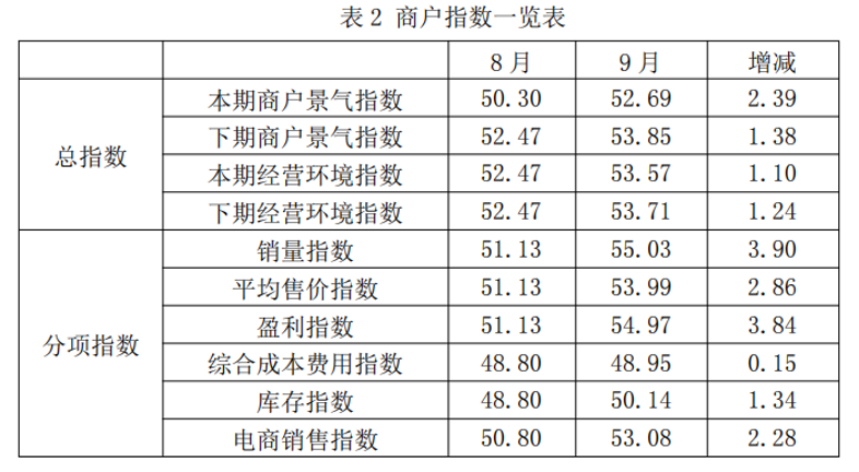 從商戶景氣指數來看,總指數中,9月商戶景氣指數爲52.69,較上期上升2.39個百分點;經營環境指數爲53.57, 較上期上升1.10個百分點。