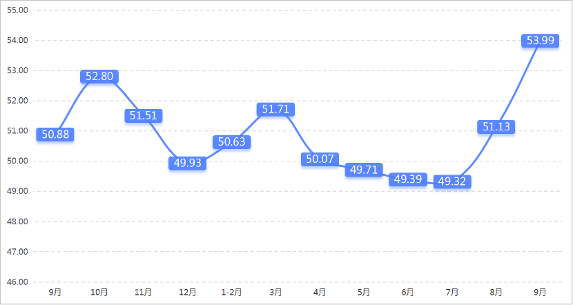 從管理者景氣指數來看,總指數中,9月管理者景氣指數爲52.42,較上期上升0.16個百分點;經營環境指數爲54.84,較上期上升0.65個百分點。