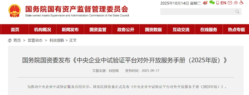 為推動中央企業中試驗證服務共用共享,近日,國務院國資委正式發布《中央企業中試驗證平台對外開放服務手冊(2025年版)》。