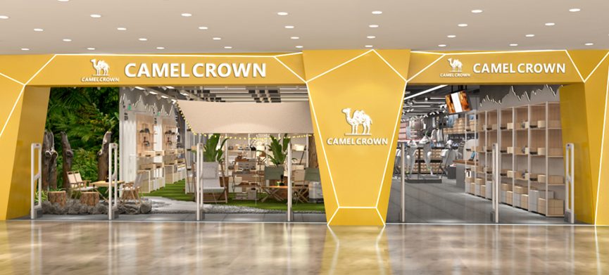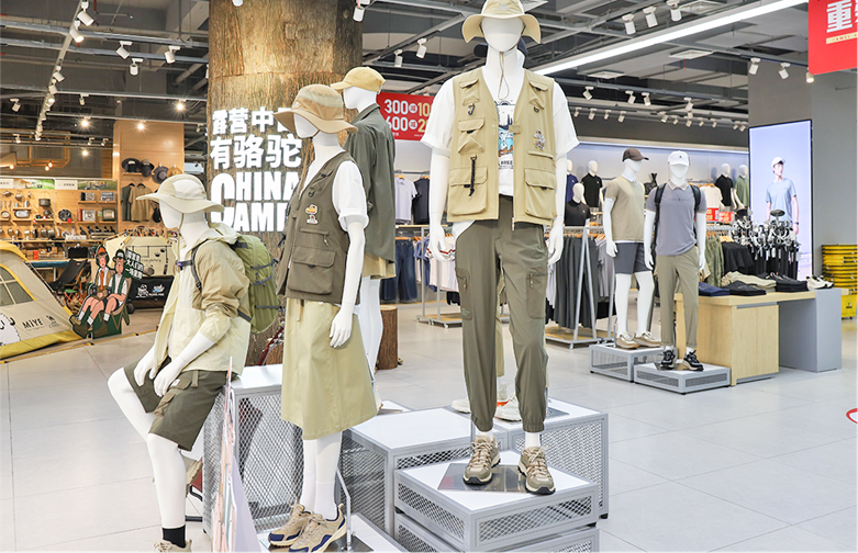 走進華南的購物中心,駱駝的戶外運動城已頗為顯眼。超1000平米的店面,有意設計為一塊“沙漠主題”沈浸式體驗場地,沖鋒衣、防曬衣、工裝鞋、旅行包、帳篷、露營桌椅等戶外產品,一應俱全。甚至在現場,還會打造一整套的露營場景。