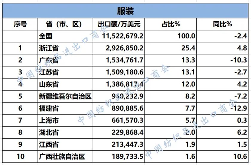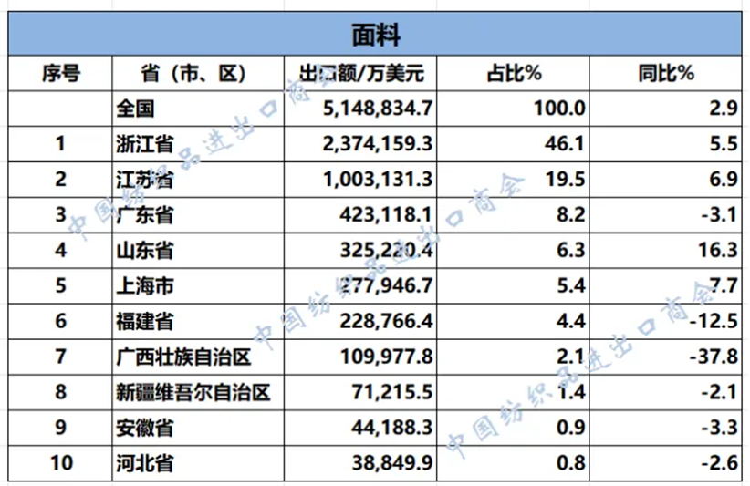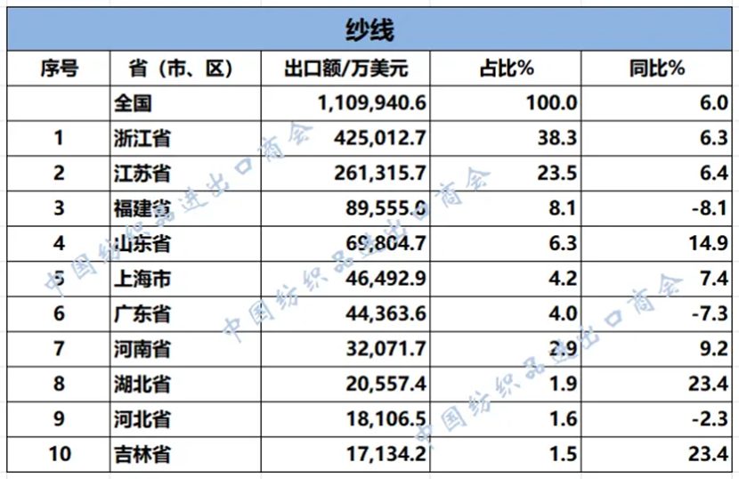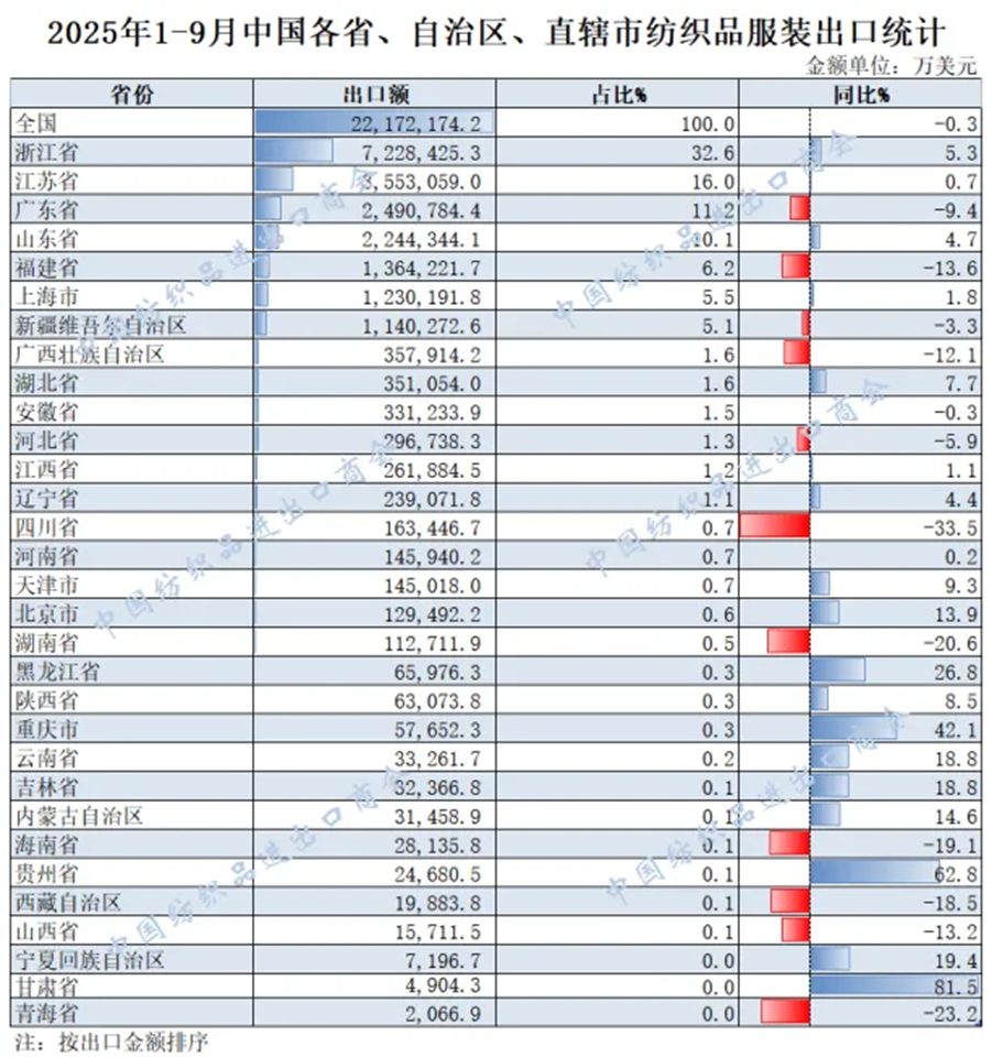 數說紡織丨2025年1-9月紡織服裝重點省市出口概況 / 市場評述, 香港紡織報 / 作者: Ann 2025年1-9月,我國紡織服裝累計出口2217.22億美元,同比下降0.3%。浙江省、江蘇省、廣東省、山東省、福建省分別列全國紡織服裝出口省市前五位,合計比重超七成。 2025年1-9月紡織服裝類重點商品出口前十名的省(市、區) 數據來源:根據中國海關數據整理