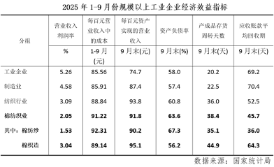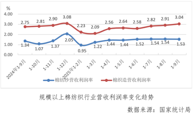 前三季度,規模以上棉紡織營業收入利潤率為2.05%,較1-8月份擴大0.04個百分點,繼續創出本年度新高,其中棉紡紗利潤率為1.53%,較上月累計收縮0.01個百分點,棉織造利潤率為3.04,較上月累計擴大0.13個百分點。
