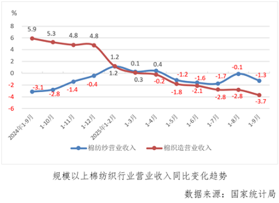 前三季度,規模以上棉紡織營業收入同比下降2.1%,已連續5個月累計下降,降幅較上月累計擴大1.1個百分點,其中棉紡紗和棉織造下降幅度分別為1.3%和3.7%,較上月累計分別擴大1.2%和0.9%。