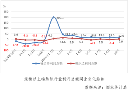 前三季度,規模以上棉紡織利潤總額同比增長7.2%,增速較1-8月份放緩0.8個百分點,其中棉紡紗利潤總額增速為12.0%,較上月累計收縮7.0個百分點,棉織造利潤總額同比增長2.9%,由上月累計下降轉為增長。