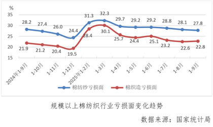 前三季度,規模以上棉紡織虧損面為25.8%,較1-8月份收縮0.1個百分點,其中棉紡紗虧損面分別為27.8%,較上月累計收縮0.4個百分點,降至年內最低點,棉織造虧損面為22.8%,較上月累計擴大0.2個百分點,處年內相對低位。
