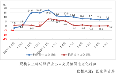 前三季度,規模以上棉紡織出口交貨值同比增長2.6%,較1-8月份增速擴大0.2個百分點,其中棉紡紗和棉織造增速分別為7.8%和0.2%,較上月累計分別加快0.5和0.1個百分點。