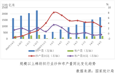 前三季度,規模以上紗產量為1730.8萬噸,同比增長2.73%,增速較1-8月份回落1.61個百分點,增速回落至年內最低點;規模以上布產量為237.7億米,同比下降0.37%,降速較上月累計放緩0.20個百分點。