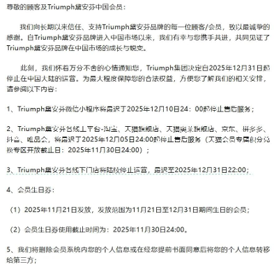 11月21日,內衣品牌黛安芬發布“關於Triumph 集團從中國大陸市場戰略撤離的告知函”,宣布Triumph集團決定自2025年12月31日起停止在中國大陸的運營。