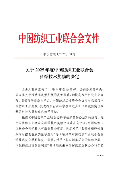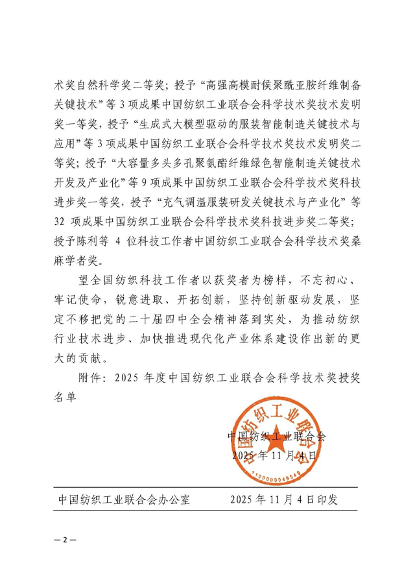 11月28日,2025年度中國紡織工業聯合會科學技術獎勵大會在北京人民大會堂隆重舉行,對年度中國紡聯科學技術獎獲獎單位和個人進行表彰。