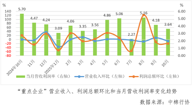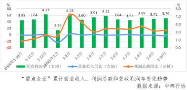 據中國棉紡織行業協會跟蹤的重點企業(以下簡稱“重點企業”)數據, 1-10月份,“重點企業”營業收入同比下降3.7%,較1-9月份降幅擴大2.3個百分點,利潤總額同比增長14.2%,較1-9月份增速擴大2.0個百分點,營收利潤率為3.79%,較1-9月份擴大0.08個百分點。
