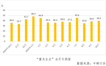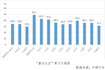 1-10月份,“重點企業”累計虧損面為31.2%,較1-9月份收縮4.8個百分點。10月份當月虧損面為39.5%,較9月份擴大0.8個百分點。
