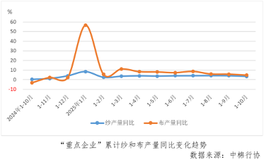 1-10月份,“重點企業”紗產量同比增長3.5%,較1-9月份增速下降0.7個百分點,布產量同比增長4.8%,較1-9月份增速下降1.0個百分點。10月份當月紗產量環比下降3.3%,由此前連續兩個月環比正增長轉為下降,布產量環比下降5.6%,較9月份降幅擴大4.6個百分點。