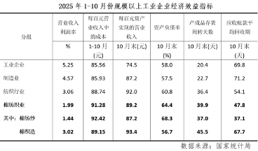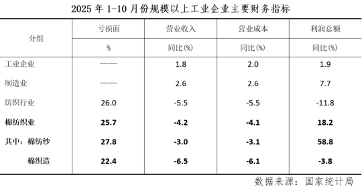 據國家統計局數據,1-10月份,規模以上棉紡織企業營業收入同比下降4.2%,降幅較上月累計擴大2.1個百分點,利潤總額同比增長18.2%,增速較上月累計加快11.0個百分點,規上棉紡織企業營業收入利潤率為1.99%,較上月累計下降0.06個百分點,其中棉紡紗對利潤率拖累較大,回落至1.44%,僅高於年初和一季度。