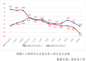 1-10月份,規模以上棉紡織企業營業收入同比下降4.2%,已連續6個月累計下降,降幅較上月累計擴大2.1個百分點,其中棉紡紗和棉織造下降幅度分別為3.0%和6.5%,較上月累計分別擴大1.8和2.8個百分點。