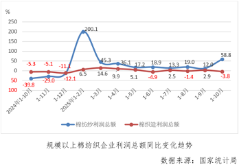 1-10月份,規模以上棉紡織企業利潤總額同比增長18.2%,增速較1-9月份加快11.0個百分點,其中棉紡紗利潤總額增速為58.8%,低基數下今年以來持續保持同比較大幅度正增長,增速較上月累計加快46.8個百分點,反觀棉織造利潤總額同比下降3.8%,由上月累計增長轉為下降。
