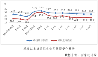 1-10月份,規模以上棉紡織企業虧損面為25.7%,較1-9月份收縮0.1個百分點,降至年內最低點,其中棉紡紗虧損面分別為27.8%,與上月持平,棉織造虧損面為22.4%,較上月累計收縮0.4個百分點,棉紡紗和棉織造均處年內最低點。