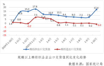 1-10月份,規模以上棉紡織企業出口交貨值同比增長4.2%,較1-9月份增速擴大1.7個百分點,其中棉紡紗增速為17.4%,較上月累計加快9.6個百分點,棉織造累計同比下降1.0%,年內累計增速首次轉負。