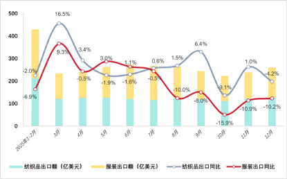 回顧全年貿易走勢,受國際市場需求波動及外部政策環境影響,我國紡織品服裝出口自8月份以後呈現波動下行態勢。一季度,全國紡織品服裝出口額為662.8億美元,同比增長0.6%,規模保持歷史較高水平。進入二季度後,外部環境趨緊,隨著美國關稅政策頻繁調整,我國紡織品服裝出口受到一定程度沖擊,增速有所放緩。下半年以來,紡織品與服裝出口走勢進一步分化,紗線和織物等紡織中間品出口增勢相對穩定,而終端產品出口規模則有所縮減。至四季度,兩大類產品出口均回落至負增長區間,其中服裝出口同比降幅擴大至12.3%。