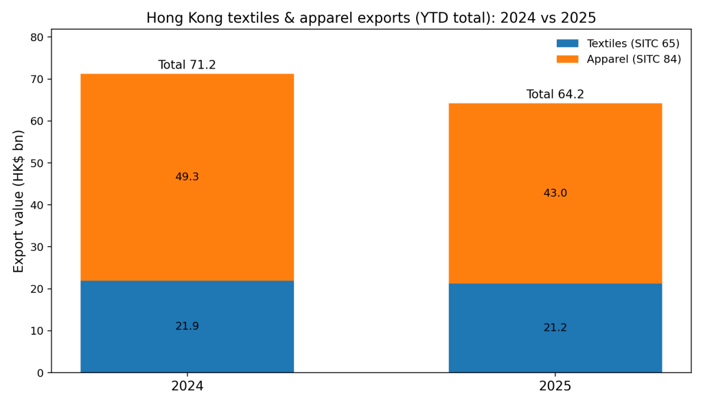 香港政府統計處最新公布按「標準國際貿易分類(SITC)二位數」統計的紡織及服裝出口數字(65:紡織紗、織物、製成品及有關產品;84:服裝及衣服配件)。以「同年累積」口徑計,2025年香港紡織服裝整體出口貨值合共642.0億港元,較2024年的712.0億港元按年下跌9.8%。