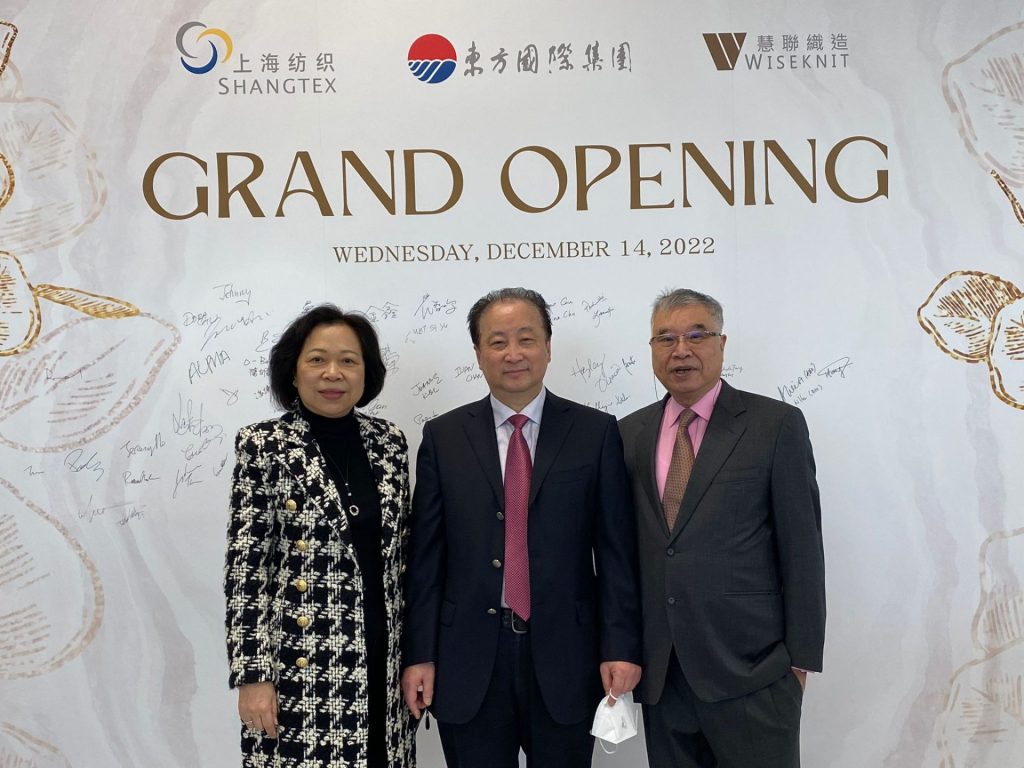 153期-常務副會長、上海紡織(香港)有限公司副董事長瞿智鳴公司的喬遷之喜 / 商會動態 / 作者: ivan 12月14日,常務副會長、上海紡織(香港)有限公司副董事長瞿智鳴(中)公司的喬遷之喜,永遠榮譽會長潘陳愛菁(左)參與,本會並送上花籃祝賀。