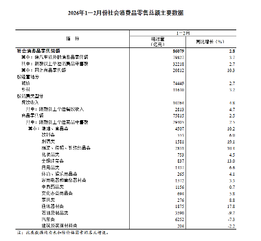 1-2月份,社會消費品零售總額86079億元,同比增長2.8%。其中,除汽車以外的消費品零售額79827億元,增長3.7%。商品零售額75815億元,同比增長2.5%餐飲收入10264億元,增長4.8%。全國網上商品和服務零售額32546億元,同比增長9.2%。