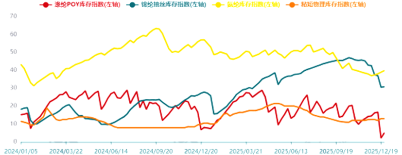 庫存方面,滌綸長絲受益於5月中旬企業集中安排停產檢修,5、6月去庫存加快,7月庫存有所回升並在中旬達到26天(以POY為例),此後呈現震蕩下降趨勢,12月末降至5天,創下近五年來最好水平。錦綸庫存大幅增加,雖然二、三季度減產幅度擴大,但僅是減緩了庫存上升速度,10月10日達到高點47天,此後庫存走低,12月末降至31天。氨綸庫存則延續2024年下半年以來的高位震蕩態勢,上半年基本維持在50天左右;7月下旬庫存出現下降趨勢,12月末降至40天。