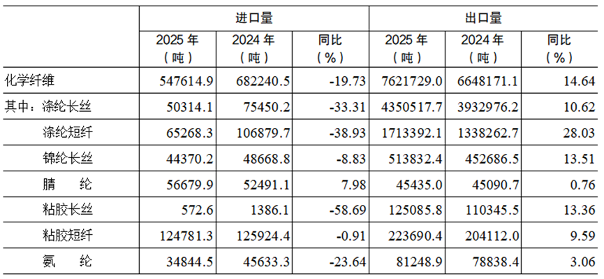 表2 2025年化纖主要產品進出口情況