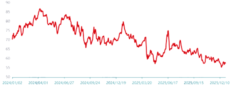 2025年,全球經濟增長放緩,導致市場對原油的需求大降,原油價格因需求不足而持續承壓,全年WTI原油價格區間在55-80美元/桶,價格中樞低於2024年,總體處於下行通道(圖2)。截至12月末,WTI原油價格下探至58美元/桶,較年初下降約20.76%。盡管原油價格整體走弱,但是局部出現過兩次大漲的階段性行情,以WTI原油價格為例,分別為1月中旬沖高至80美元/桶及6月中旬反彈至75美元/桶,背後主要推力是地緣政治沖突以及俄羅斯遭到制裁。