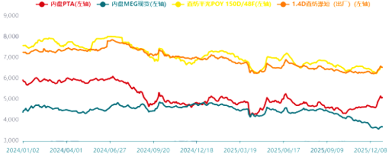 圖3 2024~2025年滌綸及其原料價格走勢圖