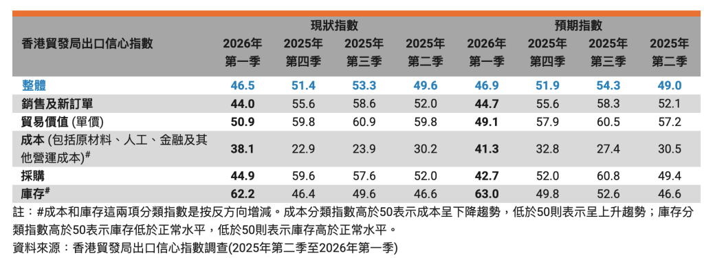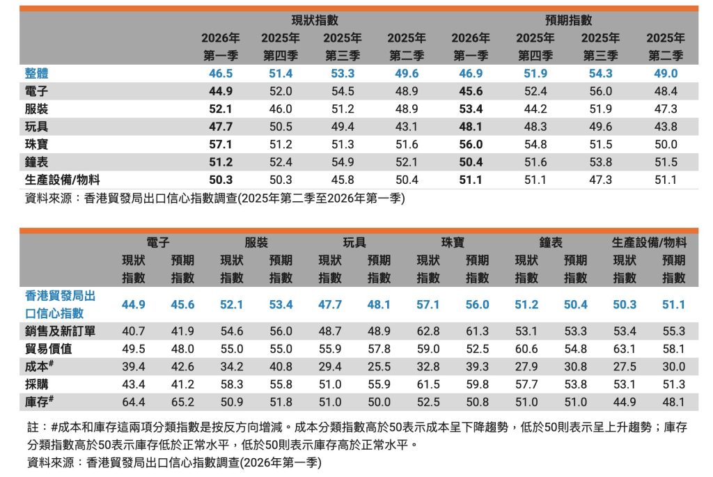 香港貿發局於3月31日公布2026年第一季出口信心指數。數據顯示,現狀指數為46.5,預期指數為46.9,反映香港出口商在面對外圍不確定因素下,整體態度普遍審慎。