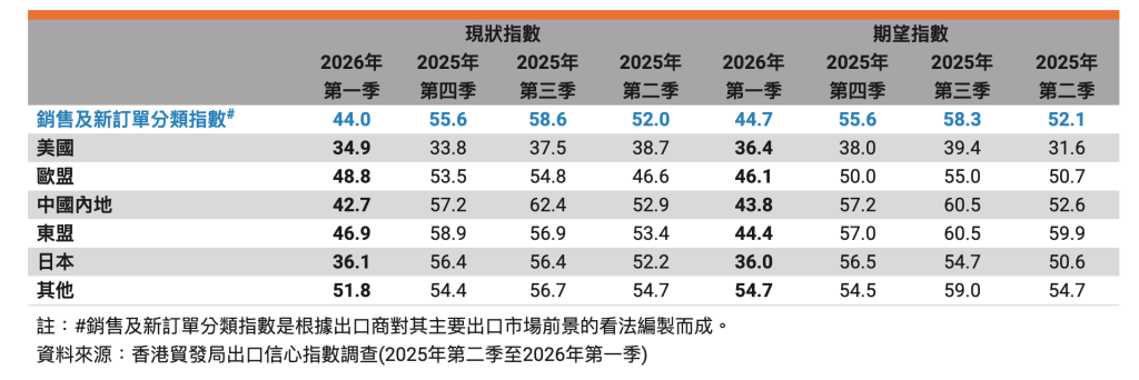 貿發局指出,指數回落,主要反映受訪出口商在美國最高法院就特朗普政府加徵關稅是否合法作出最終裁決前保持謹慎,同時亦觀望農曆新年前後市況發展。與上一季相比,現狀指數由51.4回落至46.5,預期指數亦由51.9回落至46.9。